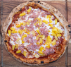 Tomato sauce, ham, mozzarella, pineapple and extra virgin olive oil.