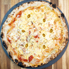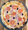 Tomato sauce, mozzarella, ham, sliced tomatoes, black olives,oregano and extra virgin olive oil.