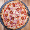 Tomato sauce, ham, bacon, pepperoni and mozzarella.